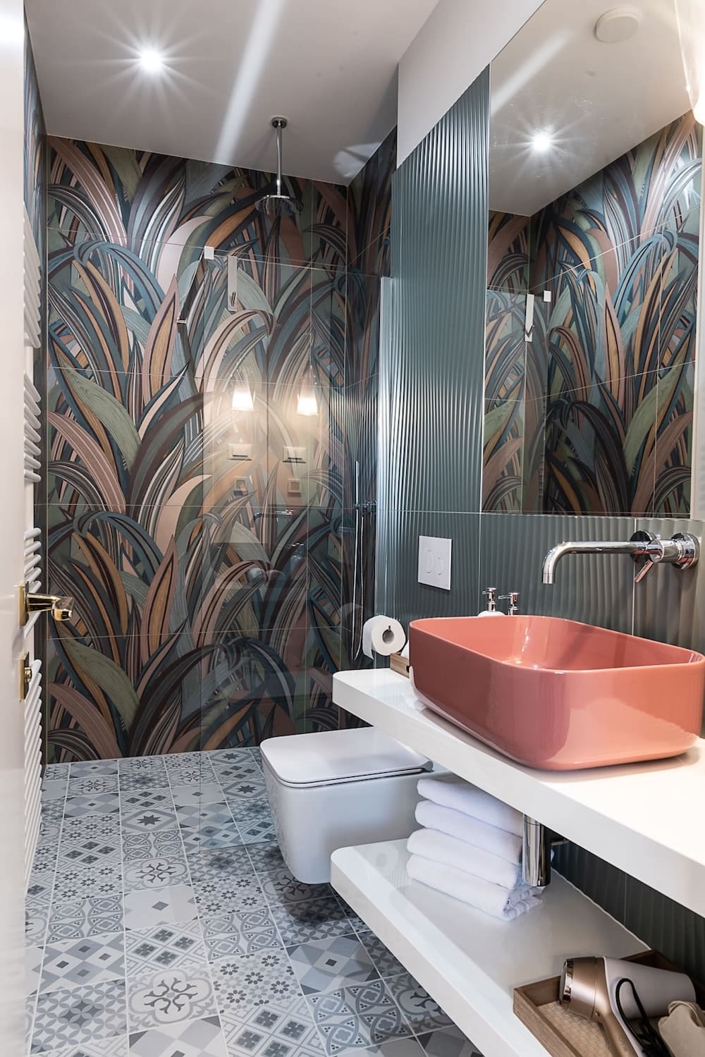 The bathroom offers elegant marble finishes and includes a walk-in shower, designer sink, hair dryer, fresh towels, and complimentary toiletries.
