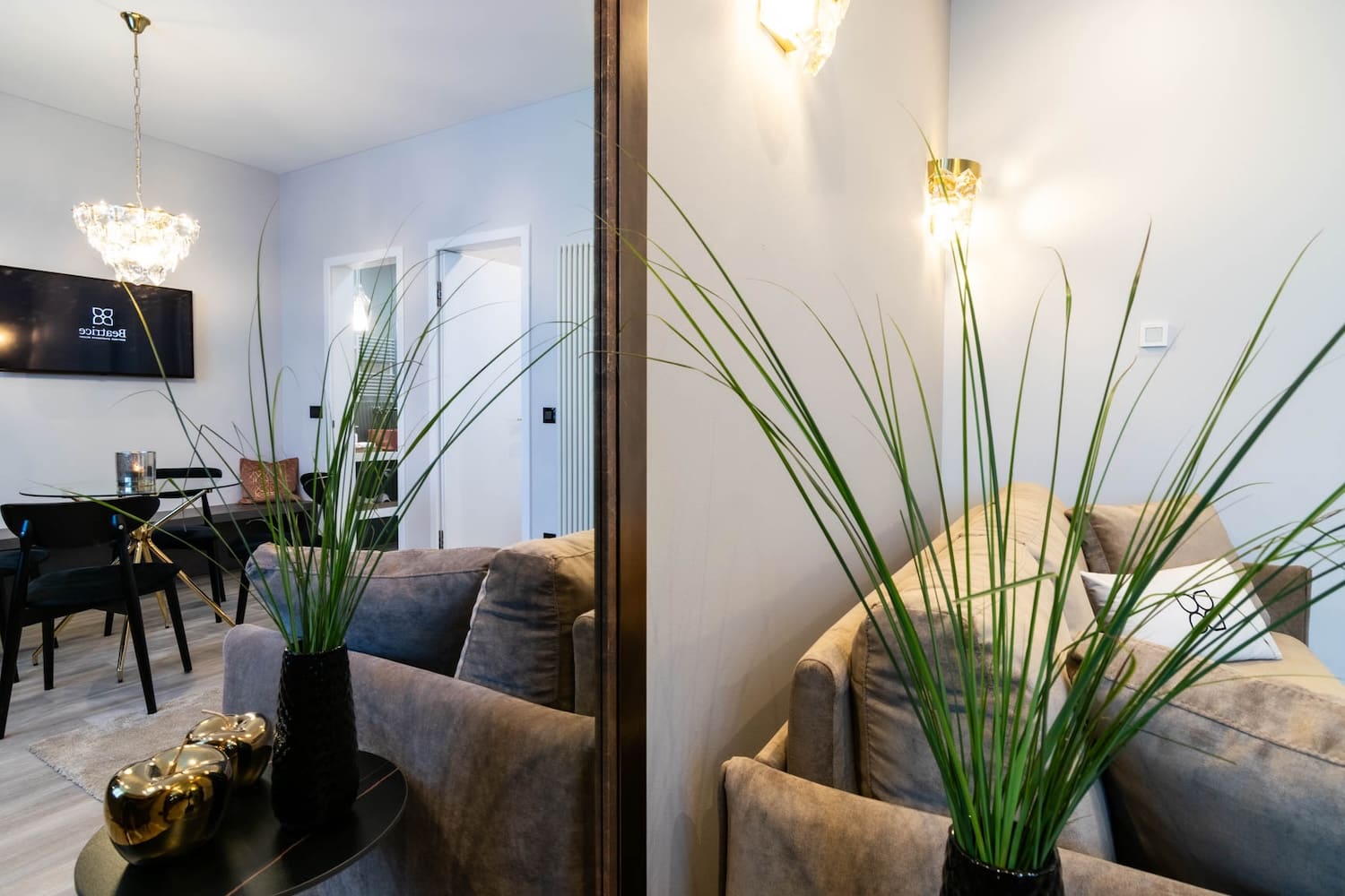 The apartment features a modern kitchen complete with refrigerator, dishwasher, induction cooktop, microwave, toaster, kettle, and coffee machine. A stylish dining area provides comfortable seating for shared meals.