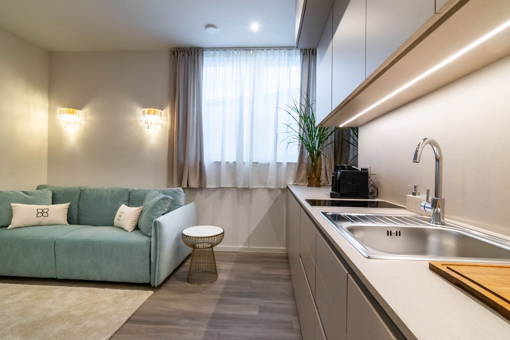 This 33 m² Deluxe King Suite offers arefined combination of gentle colors, modern finishes, and a cosy ambiance. Thesuite features a separate bedroom, ensuring privacy and comfort, while the openliving area brings in a sense of spaciousness. Large windows allow soft natural light to brighten the interior, highlighting its contemporary yet inviting design. Perfect for couples or small families, the apartment offers an elegant retreat in the stylish Cube building.