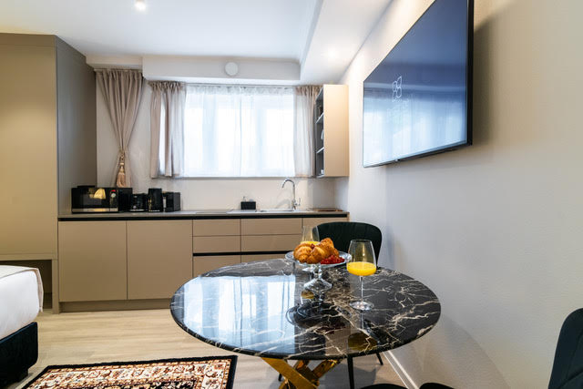 The studio features a modern kitchenette with induction cooktop, refrigerator, microwave, toaster, kettle, and coffee machine. A dining table for two completes the space, making it perfect for intimate meals.