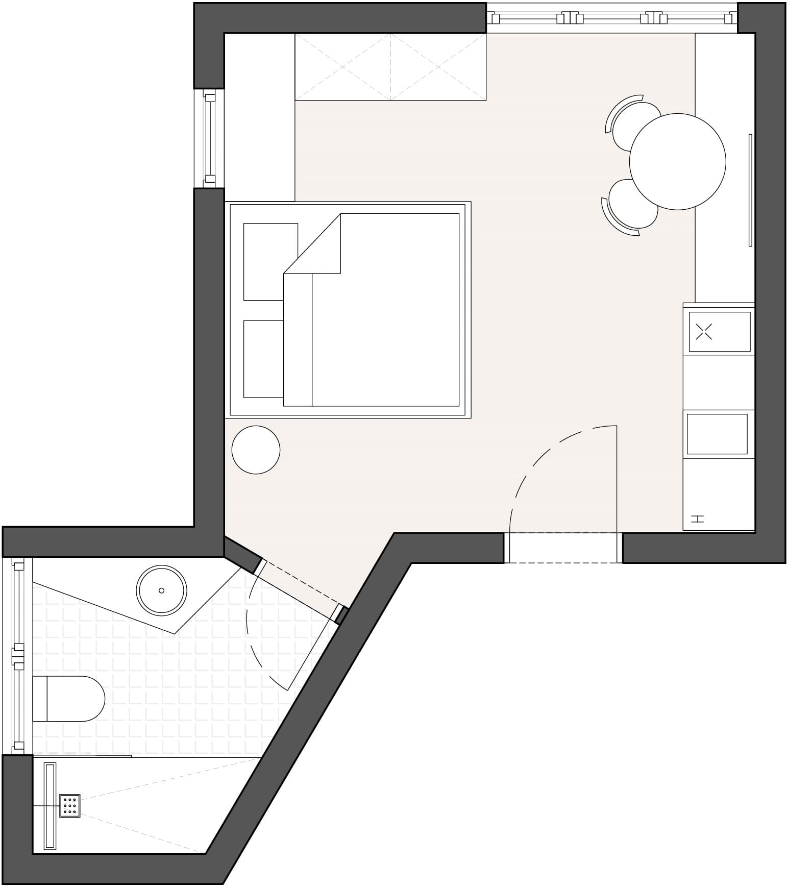 The studio offers a modern kitchenette with refrigerator, induction cooktop, microwave, toaster, kettle, and coffee machine. A small dining area is available for relaxed meals.